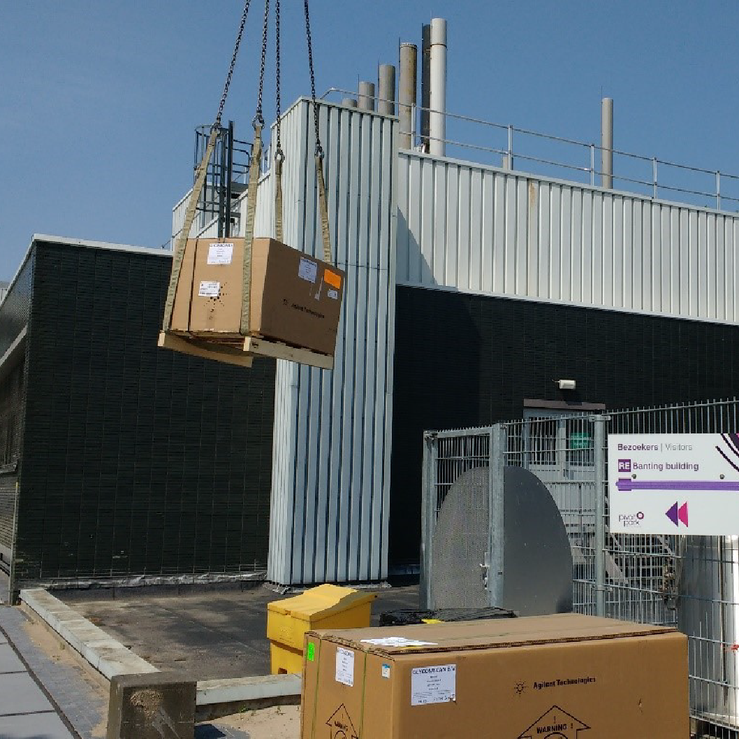 The Agilent 1290-6490 UHPLC-QqQ arrives at our new lab. It is being hoisted by a crane in our new lab located in the basement in the building at Pivot Park, Oss.